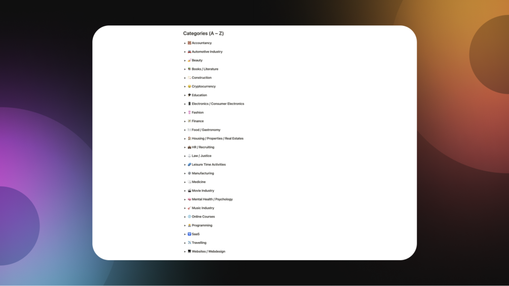 The list includes 25 categories, with each category containing 100 ideas. It covers industries like the automotive sector, fashion, gastronomy, and travel to name a few.